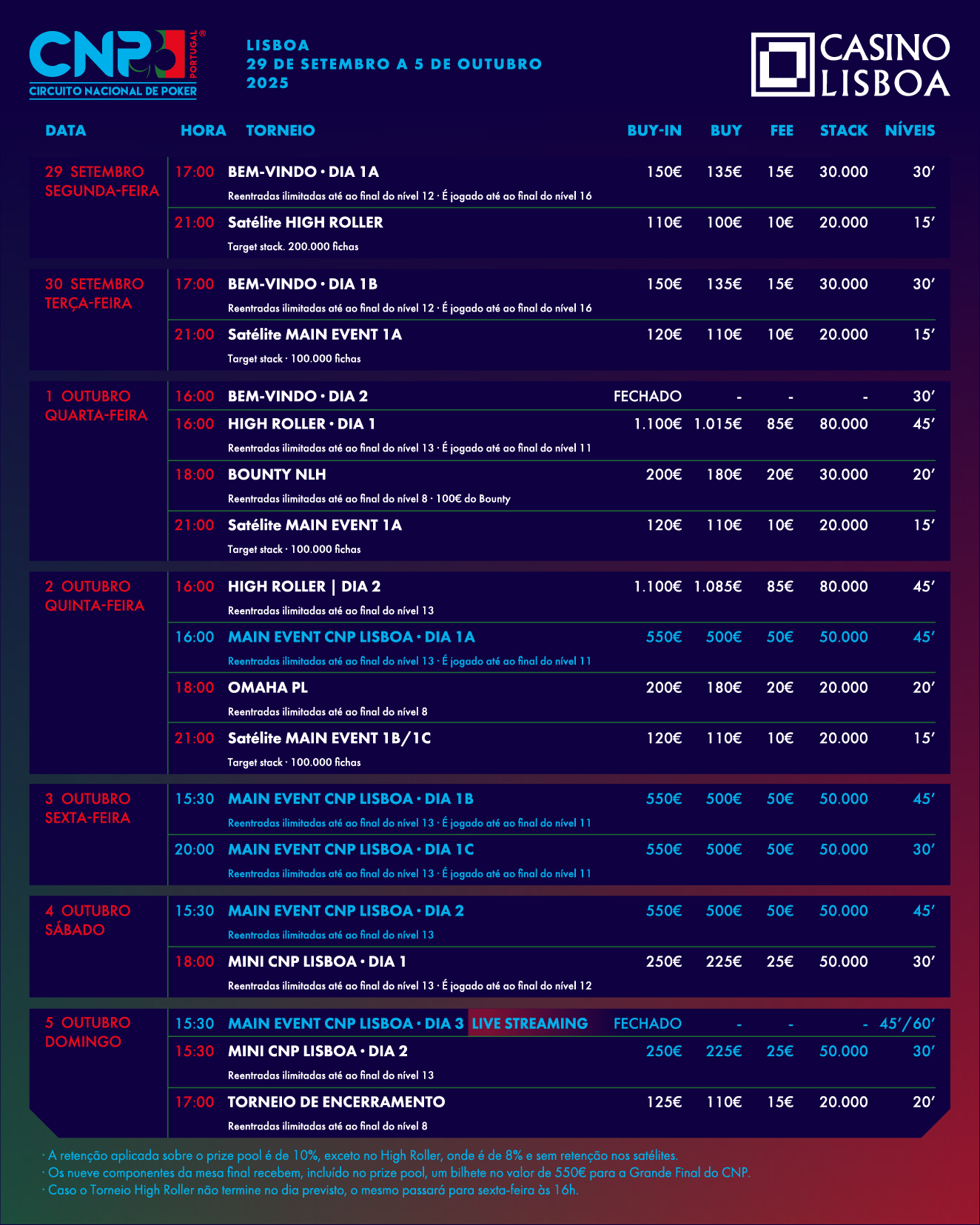 The schedule also includes several side events, such as the Knockout (€100 + €100 Bounty), Pot Limit Omaha, Mini CNP Lisboa, and the Closing Tournament.